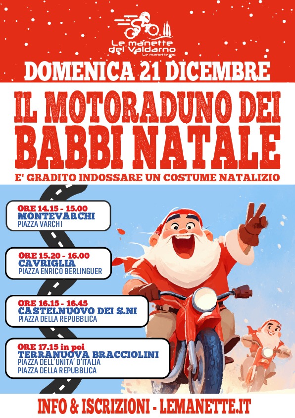 Il Moto Giro dei Babbi Natale delle Manette del Valdarno è pronto a invadere le piazze per portare un lampo di gioia (e un quintale di dolcetti) a tutti i bambini!